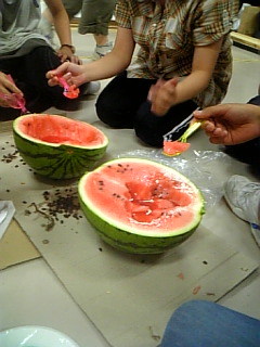 共練でスイカを食べるの図。